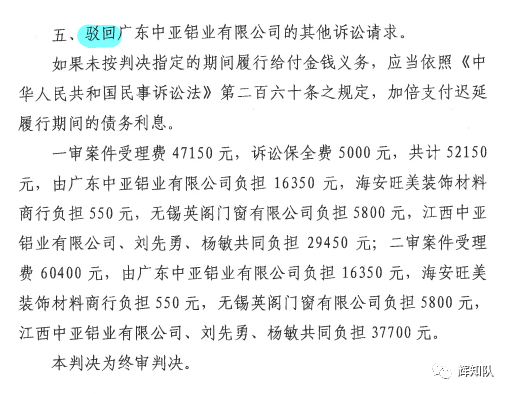 日前,辉知队代理的广东中亚铝业诉海安旺美装饰材料商行、无锡英阁门窗有限公司、江西中亚铝业有限公司、刘先勇、杨敏侵害商标权及不正当竞争纠纷一案取得最新进展。因不服苏州中院一审判决,辉知队代理原告广东中亚公司提起上诉,理由成功获得二审法院支持,判决结果如下: